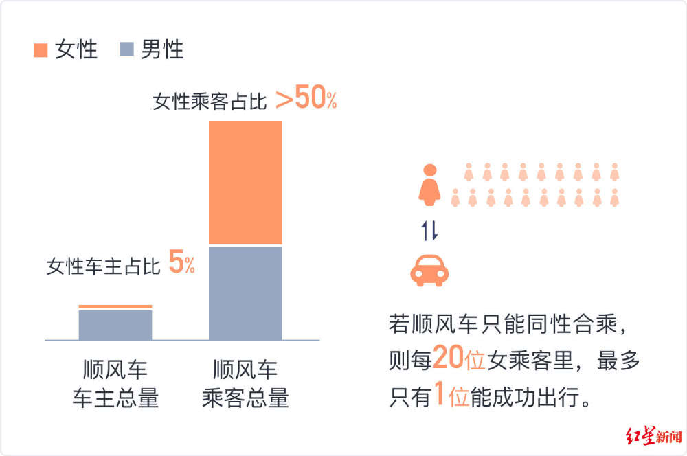 平台上女性顺风车车主仅占 5%,而顺风车乘客中女性占比超过半数。