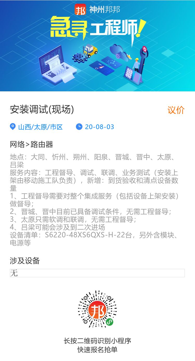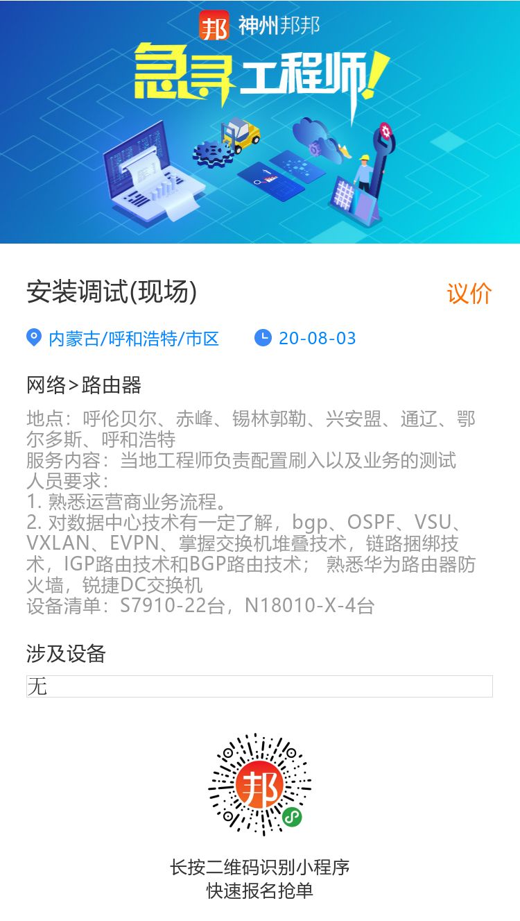 "紧急业务招募:目前,山西,内蒙,河北,福建,河南 等五地都需要匹配网络工程师,请大家注意神州邦邦的平台报名信息,或及时与我方联系。本次涉及地域较多,可先报名,后沟通执行选择地点。"
