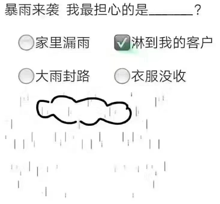 "下雨天,可以淋湿我的头发,我的衣服,我的裤子,我的袜子。。。 但是请不要淋湿我的客户,那是我的全部![捂脸] 亲们,温馨提示:雨天路滑,路上注意安全!!!"