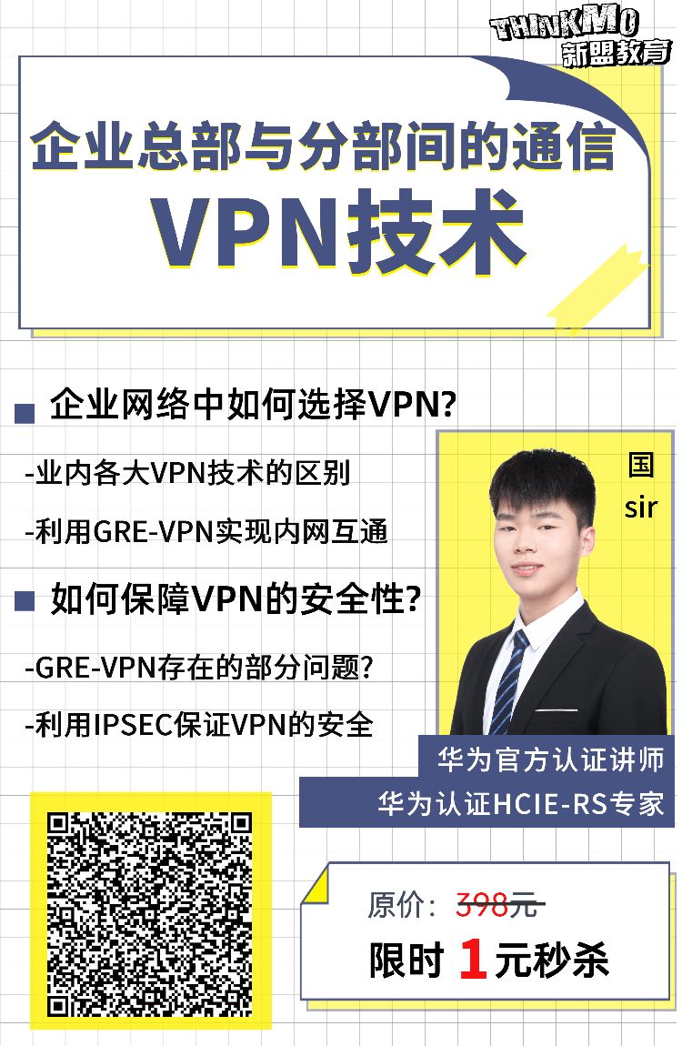 "这期讲 VPN 技术,都是企业总部与分部间最常用的,比如业内各大 VPN 技术,利用 GRE-VPN 实现内网互通,利用 IPSEC 保证 VPN 的安全等等,反正特别精华,值得一听! 扫完码后截图给老师,给你发工具包"