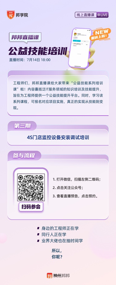 邦邦直播课,公益培训第三期,7月14日,预约直播啦!\n方式:存储图像—微信扫描二维码,即可预约!\n另外,直播培训交流群欢迎大家加入,技术探讨、培训内容建议、难题讨论等。